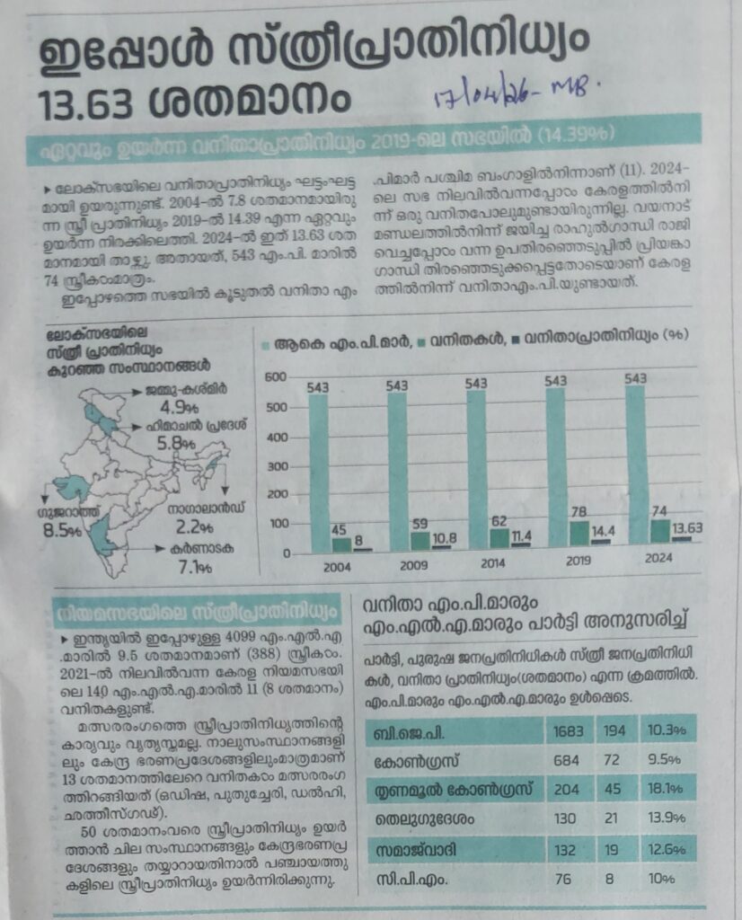 ഇപ്പോൾ സ്ത്രീപ്രാതിനിത്യം 13.63 ശതമാനം By admin | 17/04/2026 - 10:53 AM |17/04/2026 SOCIAL Bookmark the permalink.