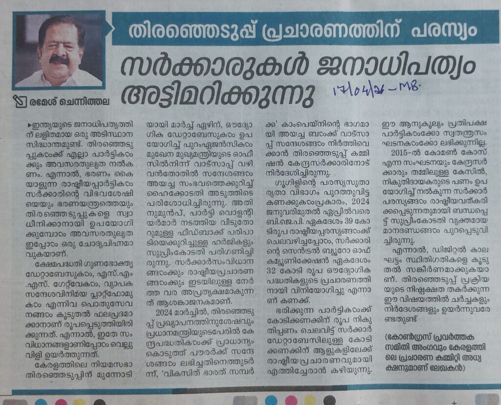 തിരഞ്ഞെടുപ്പ് പ്രചാരണത്തിന് പരസ്യം : സർക്കാരുകൾ ജനാതിപത്യം അട്ടിമറിക്കുന്നു By admin | 17/04/2026 - 10:56 AM |17/04/2026 SOCIAL Bookmark the permalink.
