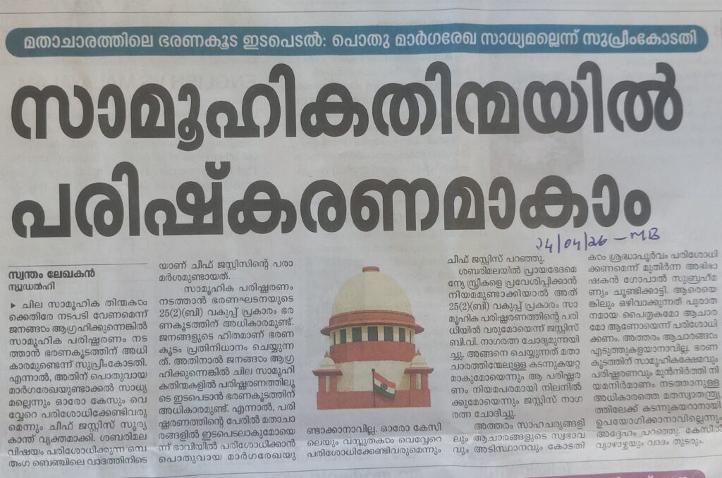 സാമൂഹികതിന്മയിൽ പരിഷ്കരണമാകാം By admin | 24/04/2026 - 10:11 AM |24/04/2026 JUDICIARY Bookmark the permalink.