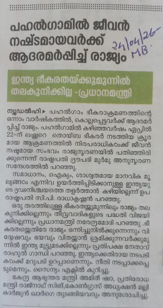പഹൽഗാമിൽ ജീവൻ നഷ്ടമായവർക്ക് ആദരമർപ്പിച്ച് രാജ്യം By admin | 24/04/2026 - 10:15 AM |24/04/2026 SOCIAL Bookmark the permalink.