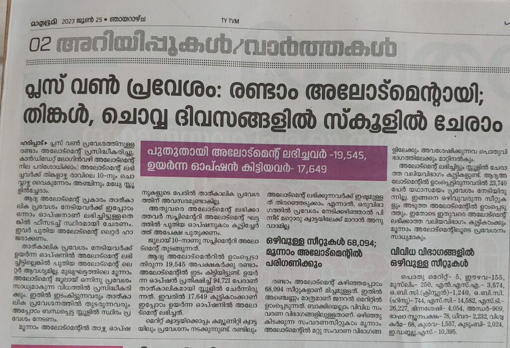 പ്ലസ് വൺ പ്രവേശം; രണ്ടാം അലോട്ട്മെൻറ് ആയി By admin | 25/06/2023 - 2:54 PM |25/06/2023 EDUCATION AND CAREER Bookmark the permalink.